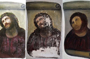 Фреска под названием Ecce Homo была создана художником Элиасом Гарсиа Мартинесом в 1932 году. С годами она сильно обветшала и стала осыпаться. Тогда 80-летняя местная жительница Сесилия Хименес попросила разрешение у настоятеля храма отреставрировать фреску. Работа шла два года, и ничего плохого сеньора Хименес не замышляла.
