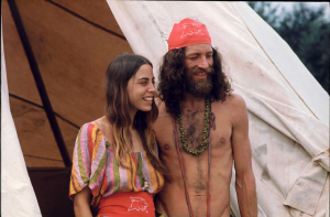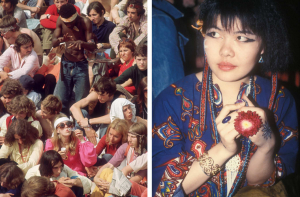 Слева: молодой хиппи сидит в Центральном парке, Нью-Йорк, 1969 год. Справа: пара ждет начала фестиваля Монтерей-Поп, 1967 год.