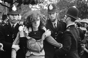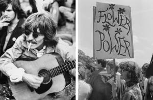 Слева: Джордж Харрисон одолжил гитару у местных хиппи, гуляя по парку «Золотые ворота», Сан-Франциско, 1967 год. Справа: демонстранты выступают за легализацию наркотиков в Гайд-парке, Лондон, 1967 год.