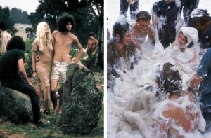 Слева: Вудсток, 1969 год. Справа: люди, покрытые пеной, веселятся на фестивале Isle of Wight.