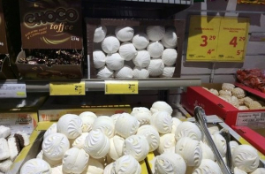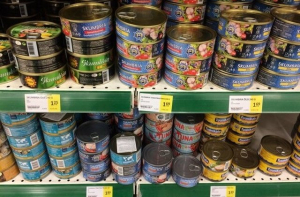 Самые разные консервы. Цены вроде бы соотносимы с нашими, но выбор другой. Тут, в основном, все импортное. У нас - российское, казахстанское.