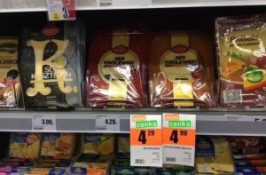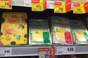 Сыр в Польше тоже неплохой. 88 рублей за такой кусочек. Но есть и дешевле, вверху часть ценника (целиком не попал) по 3 злотых, это 52 рубля.
