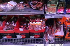 Польские колбаски - почти легенда. Видов миллион. И все вкусные! От 100 рублей за пачку, но бывают и дешевле. Вон, нарезка колбаски - 60 рублей. И это мясо!