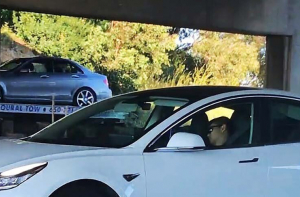 Видно, что белый Тесла движется с постоянной скоростью, а мужчина, кажется, дремлет, повернув голову в сторону бокового окна водителя.