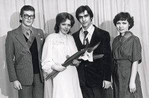 Марина Бутусова: «Первое впечатление от Бутусова - глаза. В колхозе, куда нас отправили на картошку сразу после поступления в институт, Слава носил вязаный «шлем» с узкой прорезью на лице, за что и получил смешное прозвище среди однокурсниц… «Серая шапочка только и ходит на утреннюю гимнастику, чтобы на тебя поглядеть», - как-то сказала мне подружка. А я обычно не смотрела по сторонам и многого не замечала. Стала тоже потихоньку приглядываться к Славе… Подойти он решился ко мне только на посвящении в студенты. Мы оба отучились в художественных школах и уже в 16 лет поступили в Свердловский архитектурный институт, но на разные факультеты. И вот когда получили зачетки, Слава вызвался проводить меня до «Уралмаша». Сам он при этом жил на другом конце города, куда потом до глубокой ночи добирался на перекладных.