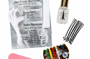 Состав: блистер с жидкостью для снятия лака, дезодорантом и пятновыводителем, маленькая пилочка, запасные застежки для сережек, мини-набор для шитья, 6 невидимок и резинок для волос, бесцветный лак для ногтей.