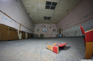 Тут обнаружилась «шведская стенка», от которой уцелела лишь одна секция, пловцовский тренажёр-«скамейка» (без блоков и тросов), некоторое количество баскетбольных мячей в ассортименте (советских). Под потолком зала были натянуты тросы, чтобы подвешивать канаты для лазания.