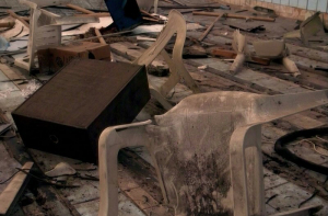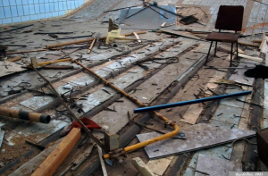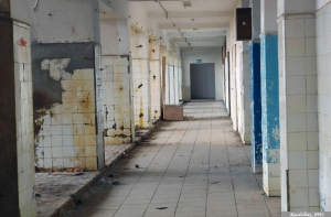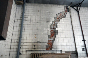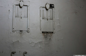 Нештатные перегородки сильно нагрузили ванну бассейна (мысленно прибавьте ещё вес воды, когда ванна была полностью заполнена. Нужно ещё учесть что она стоит не на фундаменте, а на несущих конструкциях здания - прямо под ней бывшая мужская раздевалка). Что привело к закономерному результату. Одна из несущих стен треснула, по строительным «маячкам» на ней можно проследить даты, когда эта трещина подвергалась ревизии.
