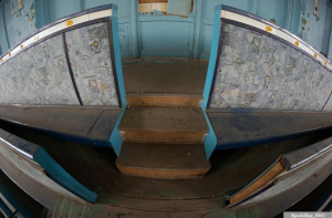 При желании спортзал легко превращался в кинотеатр. На что прямо указывают ряды кресел сдвинутых в угол, а также проекционные окошки под потолком зала: