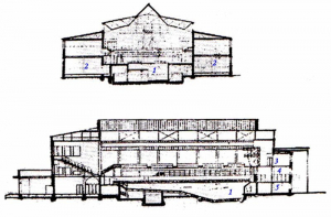 А вот чертёж здания ещё тридцатых годов. Общая планировка мало изменилась, за исключением уже упомянутого амфитеатра, так что воспользуюсь этим чертежом для виртуальной экскурсии по «Дворцу».