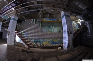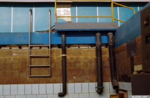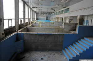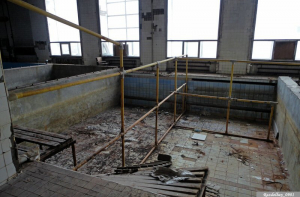 Вот общий вид на то, во что превратился плавательный бассейн. Помню, когда его после чистки наполняли водой, очень тёплой, и глубина была по колено, мы с ребятами залезли туда поваляться в горячей воде, побрызгаться и похулиганить… Ностальгия…