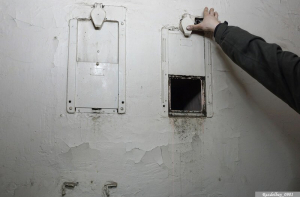 Пройдём тогда в кинобудку. Вот эти окошки с обратной стороны, закрыты противопожарными заслонками.
