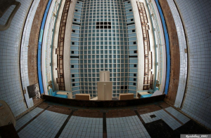 Общий вид на центральную ванну 1, которую во времена дельфинария разделили на неравные части кирпичной перегородкой с подводными окнами.