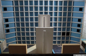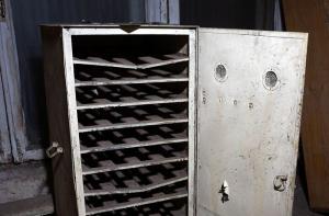 Внутри стеллажи для катушек киноплёнки и вентиляционные отверстия на дверце.
