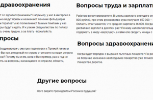 Пенсии, обманутые дольщики, аварийное жильё, низкие зарплаты, здравоохранение - вопросов на эти темы ожидаемо много. Но попадаются не очень серьёзные вопросы. Если вам совсем нечем заняться, то можете их найти по ссылке. Люди предлагают сделать среду выходным днём «или хотя бы дать этот день для многодетных мам», интересуются, каким шампунем пользуется Путин, как относится к карикатурам про себя, какую художественную литературу читает и пр.