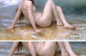 На картине «Волна» модель опирается руками на объемный предмет, который имеет мало общего с песком на пляже. Такой прием был привычен для мира искусства: никто не будет позировать в обнаженном виде на берегу моря по 4–8 часов в день, тем более в XIX веке. Но почему-то художник не попытался сгладить углы, расположив руки модели иначе.
