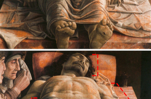На работе Мантеньи четко прослеживается искажение пропорций: большая голова Христа, длинные руки и короткие ноги. Считается, что художник намеренно уменьшил размер ступней. Внимание благодаря этому акцентировано на грудной клетке.