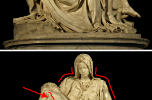 «Оплакивание Христа», или «Пьета», - единственная работа, которую Микеланджело подписал. Скульптура создает уместное ситуации настроение, и она так прекрасна, что небольшие неточности перестаешь замечать. Но обратите внимание на соотношение тел Марии и Христа - ее хрупкую фигуру пришлось «усилить» огромным количеством драпировок, чтобы композиция пришла в баланс. Ее руки, ноги и плечи выглядят крупнее, чем у Христа.