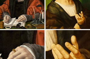 У Мабюза пальцы рук на некоторых картинах слишком длинные, необычно изогнуты, и изумительная реалистичность живописи усиливает этот эффект. Долго и неподвижно позировать проблематично, поэтому неудивительно, что детали полотен могли меняться в процессе, а ошибки были неизбежны.