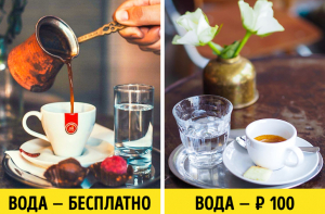 Вы заказываете кофе по-восточному, к которому бесплатно полагается стакан воды. Но хитрый официант попытается заменить его на позицию из меню и спросит, принести ли вам минеральную воду с газом или без. Если не уточнить, что нужна обычная вода к кофе, вы заплатите за два напитка вместо одного.
