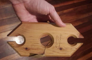 В центральное отверстие этого приспособления вставляется бутылка вина, а в два крайних – продеваются бокалы ножкой вверх