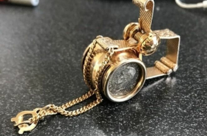 Специальная клипса, которую использовали для того, чтобы прикрепить перчатки к одежде. Скорее всего, она была с украшением, которое потерялось, и вместо него была вставлена монетка.