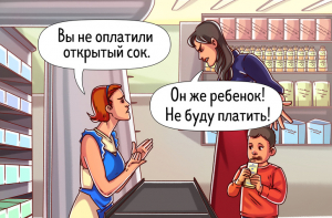 Для некоторых взрослых ребенок - своего рода разрешение на любое удобное им поведение, даже если оно выходит за рамки общественных норм. Выражаться это может в любых мелочах: пройти без очереди в супермаркете, даже не попросив пропустить, раздеть ребенка посреди парка, чтобы он справил нужду, или провести уже довольно взрослого сына в женскую раздевалку. И, как правило, на любое даже вежливое замечание такие родители готовы разразиться тирадой о том, что их права ущемляют.