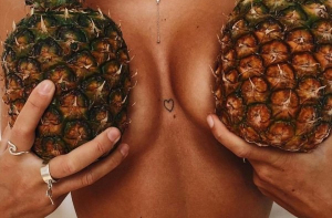 Девушки очень любят ананасы. Любят позировать с ними, носить одежду с их изображением, пить ананасовые коктейли и даже делать такие татуировки. А еще некоторые из них используют ананасы как бюстгальтеры, и выглядит это довольно привлекательно.