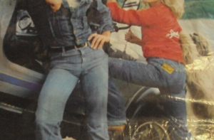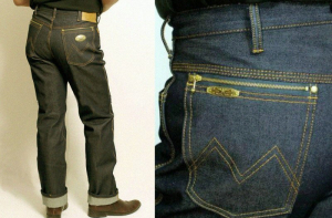 Как считается, изначально материал производился в Италии, на что указывал флажок-триколор на заднем кармане джинсов. Модель отличалась высокой посадкой и прямым кроем, который мы бы сейчас назвали slim, и плотно облегала бедра.