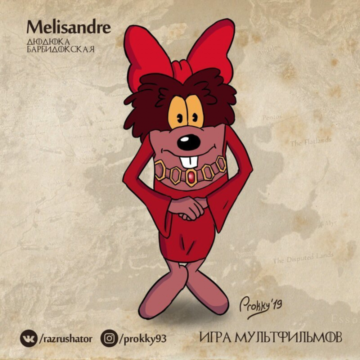 Обладающая магическими способностями и неравнодушная к красному цвету героиня мультфильмов «Подарок для Слона»и «Клад» Дюдюка Барбидокская - хороший претендент на роль Красной жрицы Мелиссандры