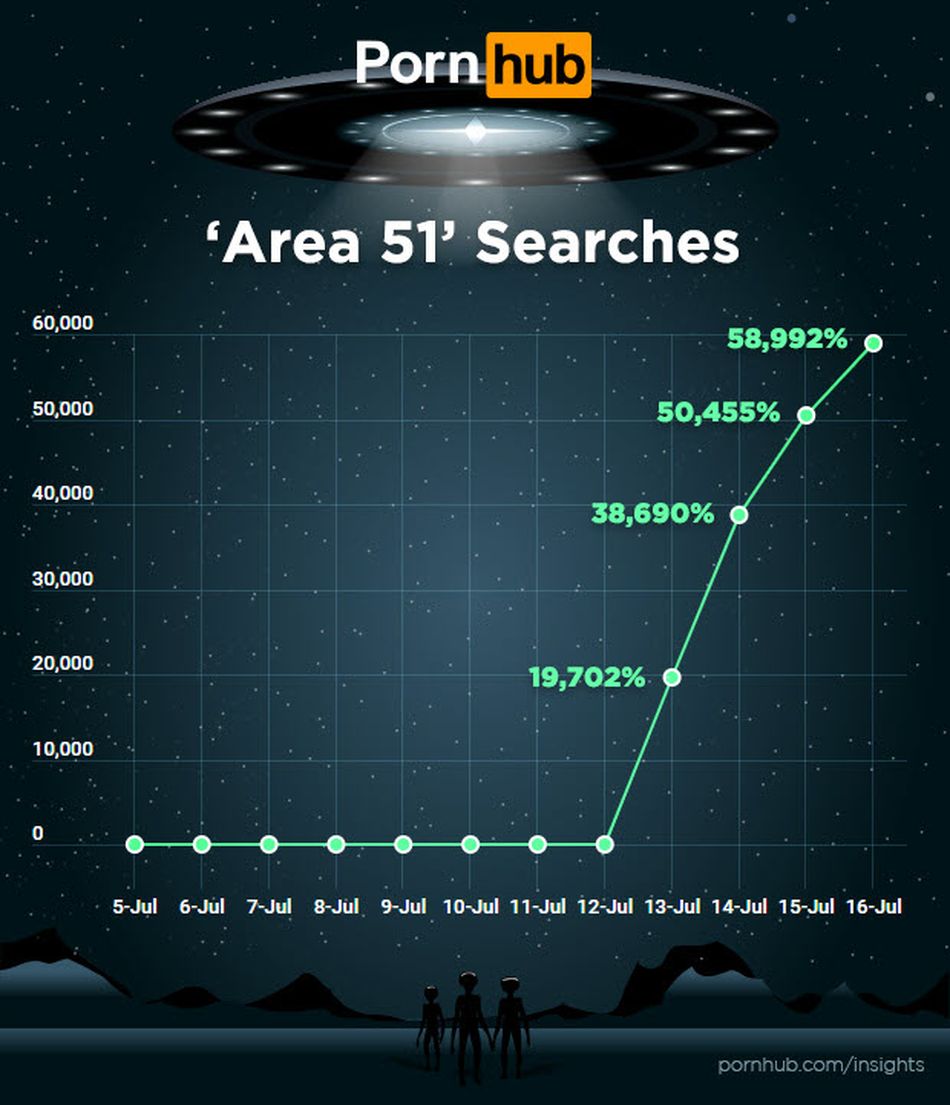 Что касается «пришельцев», то на самом деле это не редкий термин для поиска в Pornhub, в котором за последний год ежедневно проводилось более 30 000 поисков по этой теме. Но за последние недели эти поиски выросли на 217% 2 июля и на 199% 14 и 15 июля.