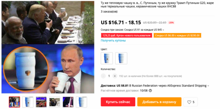 От внимательного глаза предприимчивых китайцев не ускользают даже самые незначительные детали. 28 июня Путин ужинал в японской Осаке и пил чай из белого термостакана с российским гербом. Китайцам, понравилась эта кружка. Наследующий день продавец китайского интернет-магазина принял 100 предзаказов на термостакан как у президента. Через неделю было продано 5 тысяч путинских кружек. Запрос «кружка Путина» попал в топ-100 самых популярных запросов.