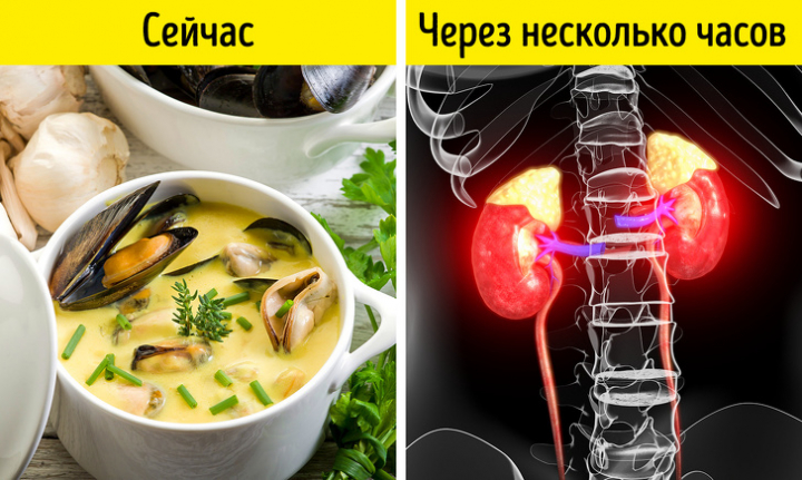 Сливочный соус и морепродукты - такое сочетание может стать причиной тяжести в желудке вплоть до ощущений, напоминающих отравление. Причина в том, что при встрече двух разных видов белка происходит передозировка организма протеинами и он просто не справляется с такой нагрузкой. Возникает тяжесть в желудке, тошнота, может быть осложнение на почки, особенно если к этому есть предрасположенность.