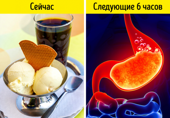 Любимое сочетание детей при походе в заведения фастфуда оказывается наиболее опасным для них же. Хотя и взрослый желудок плохо переносит этот «тандем». И если у здоровых людей после такого перекуса может многие часы (до 6 часов) сохраняться сильное вздутие и тяжесть в животе, то у тех, кто страдает диабетом, язвенной болезнью желудка или гастритом, болезненные состояния могут обостриться значительно. После мороженого диетологи рекомендуют пить воду, чай или кофе.