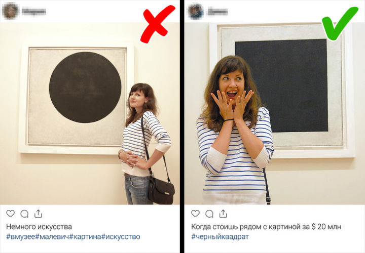 Фотографии людей, просто стоящих рядом с известными картинами, не вызывают у окружающих никаких эмоций. Все понимают, что единственная цель - показать всем, что человек ходил в музей. Такое хвастовство формирует впечатление об авторе фото как о поверхностной и недалекой личности.