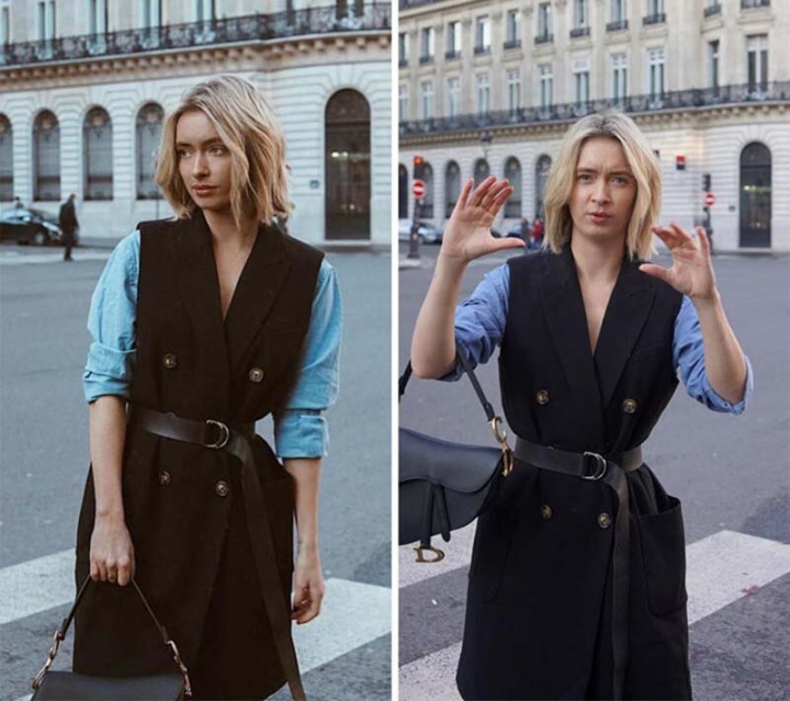 В своей серии снимков «бок о бок» она поделилась позами, которые достойны того, чтобы украшать какой-нибудь журнал, рядом с веселыми и откровенными кадрами, используя для их создания один и тот же наряд.