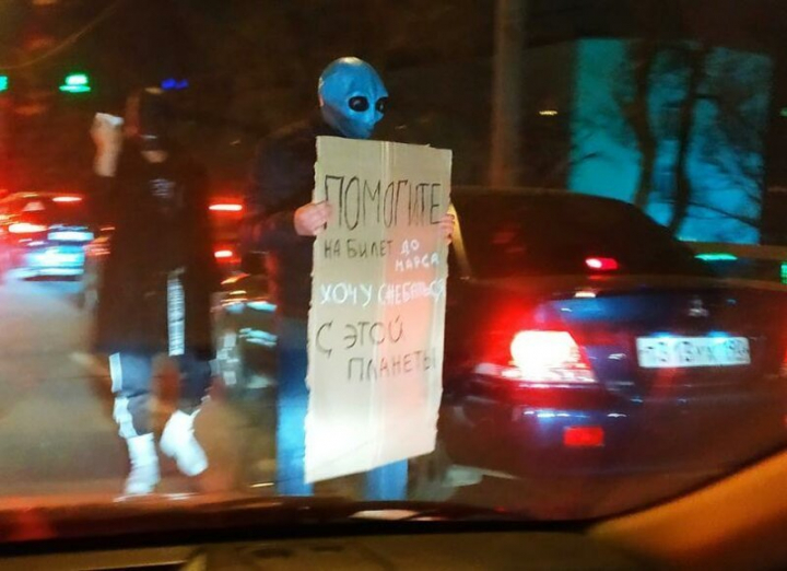Подростки заигрывают с попрошайничеством, когда выходят на улицы с плакатами «Помогите на билет до Марса!» или «Не хватает на смузи!». Прохожие с улыбкой кладут им деньги в шляпы. Как сказал Лайфу уличный музыкант, шутники-попрошайки в день могут заработать до восьми-десяти тысяч рублей. Особенно они любят бродить по пятничным пробкам, а за отдельную доплату соглашаются протереть фары машин.
