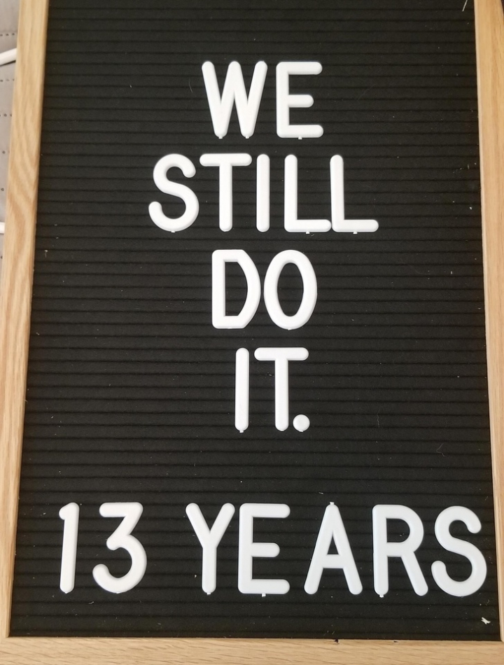 We still do it. 13 years. - «Мы все еще делаем это. 13 лет». (Первоначальный вариант: We still do. 13 years. - «Мы по-прежнему любим друг друга. 13 лет».)