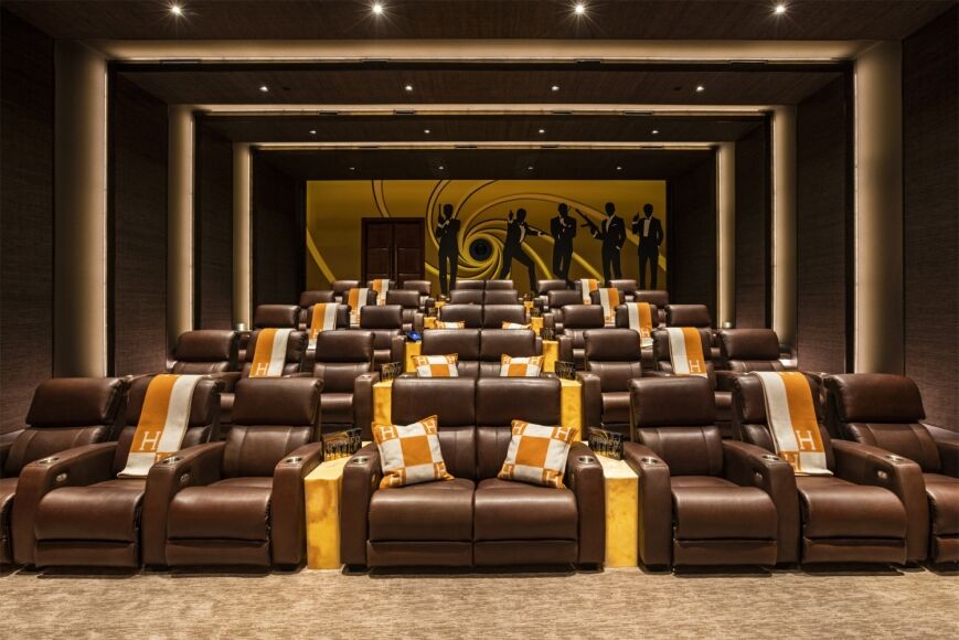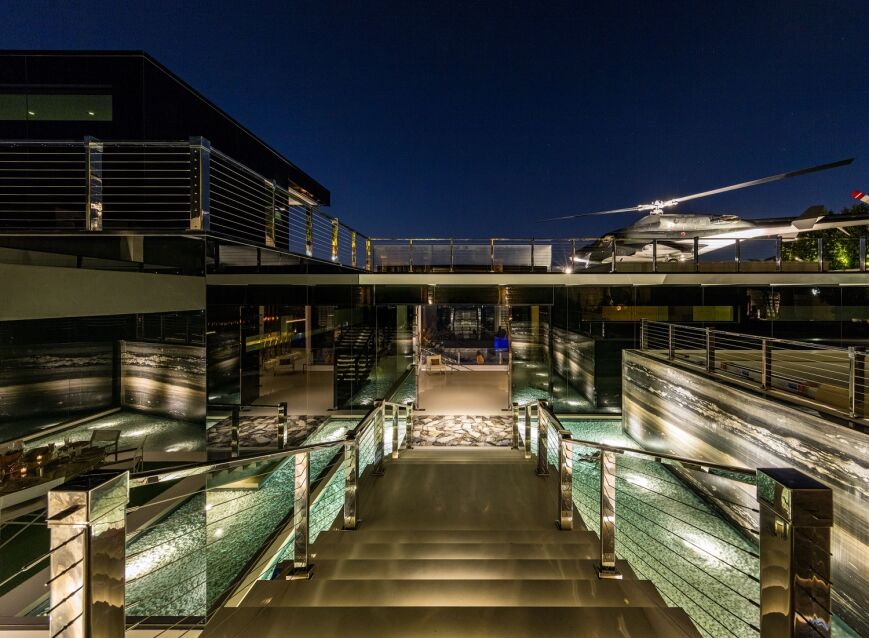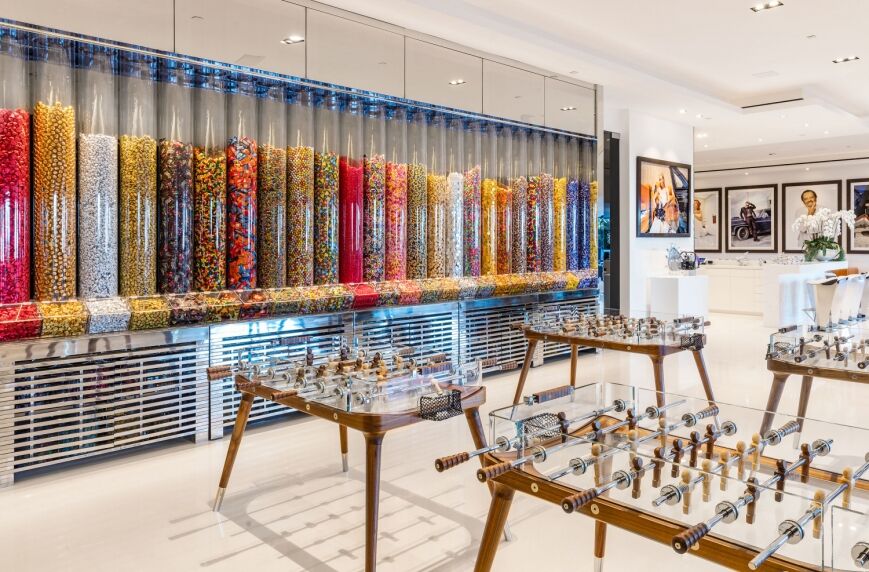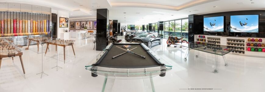 Этот экстравагантный 4х уровневый особняк включает в себя вертолетную площадку, пять баров, боулинг, кинотеатр на 40 мест, спа-салон, гараж с ретро-автомобилями, 21 ванную комнату, большое хранилище со спиртным, 85-футовый пейзажный бассейн и массивную стену с конфетами. Всё это хозяйство обслуживает 7 человек прислуги.
