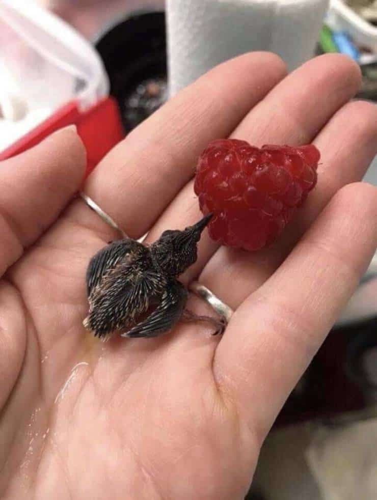 Птенец колибри, пьющий сок из малины.