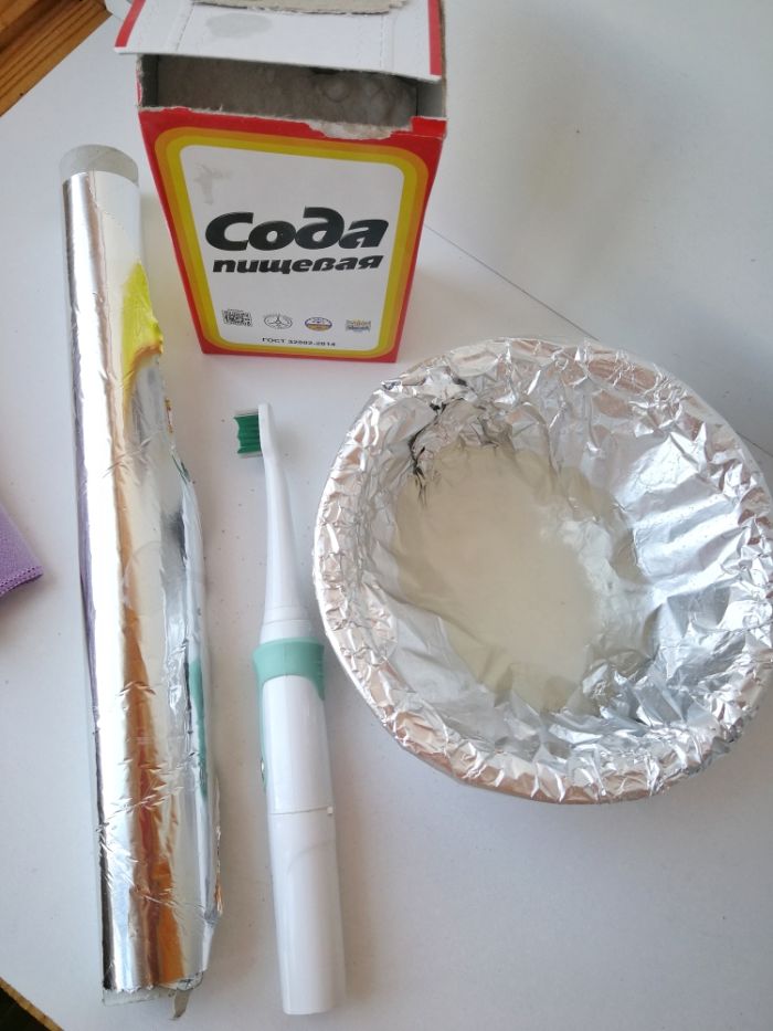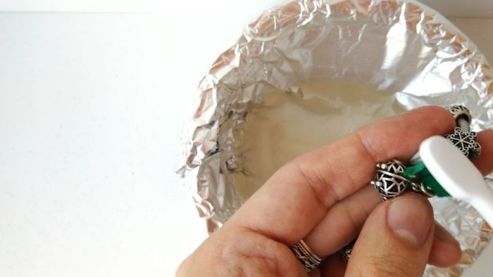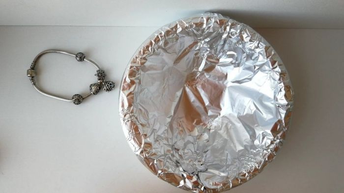 Миску нужно застелить фольгой, насыпать пару ложек соды и залить всё горячей водой. Когда раствор начнёт шипеть, можно опустить туда серебряное изделие - и подождать около десяти минут. После реакции вода станет мутной, а налёт на украшении исчезнет.