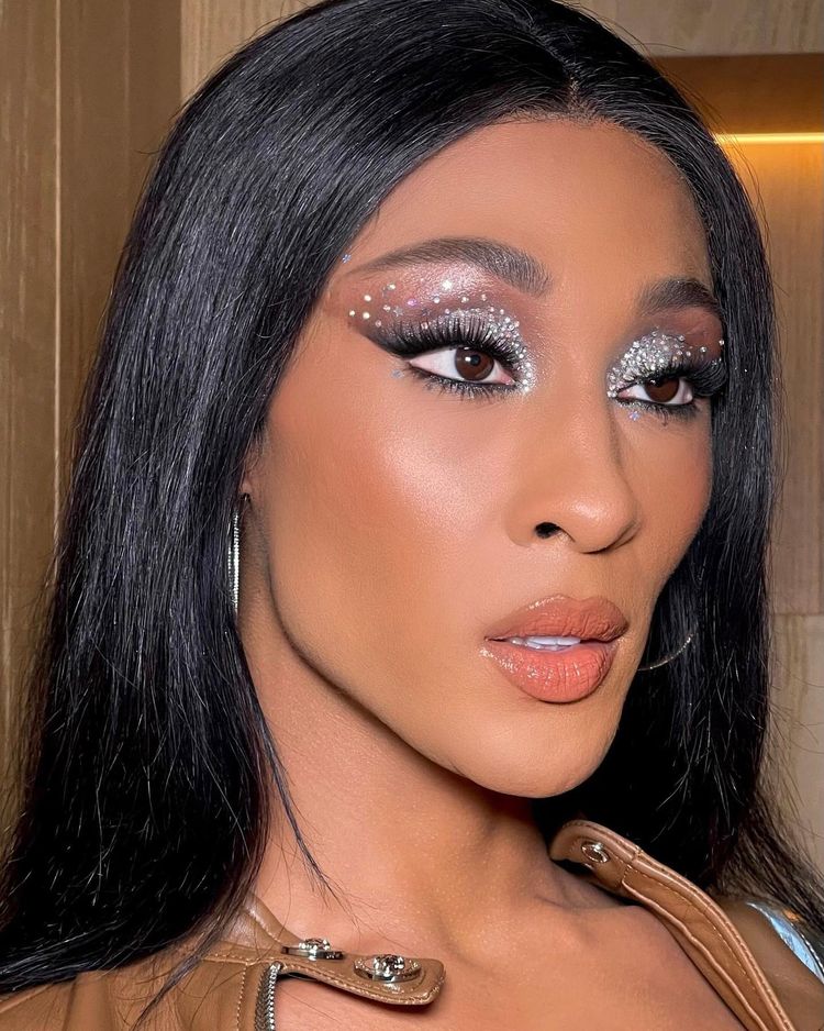 Если не сейчас, то когда? Классический дымчатый макияж обретает второе дыхание, если добавить в него россыпь кристаллов. Чтобы не мучиться с клеем для ресниц в праздничной спешке, выбирайте самоклеящиеся стразы разных размеров. Хаотичное сияние на веках создаст эффект драгоценной вуали.