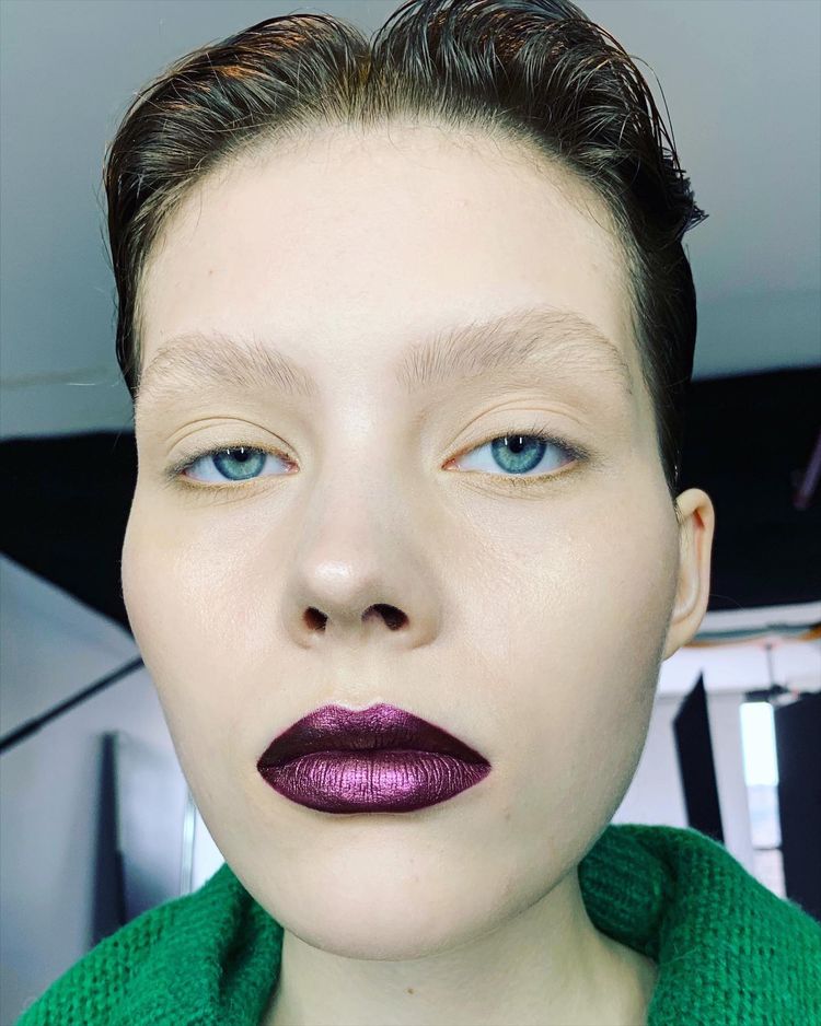 Для тех, кто готов заявить о себе. Металлический финиш на губах выглядит куда свежее привычного глянца. Маленький лайфхак от визажистов: нанесите любимую помаду глубокого оттенка (например, винного или фиолетового), а в центр губ вбейте пальцем немного «металлических» теней или пигмента. Эффект объема гарантирован.