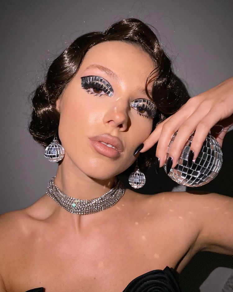 Настоящий арт-объект на вашем лице. Этот образ требует подготовки: нужно заранее разметить форму века белым карандашом, а затем заполнить пространство кусочками светоотражающей слюды или специальными крупными пайетками. Сложно? Возможно. Эффектно? Невероятно.