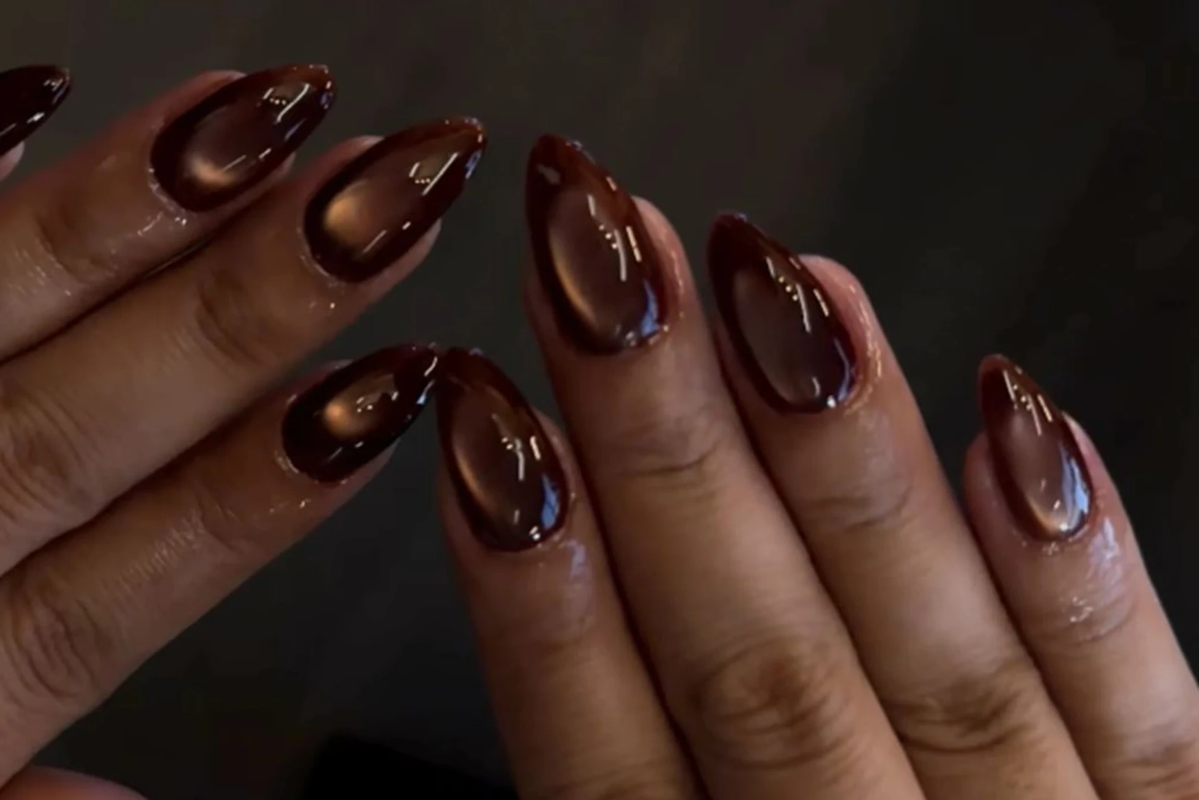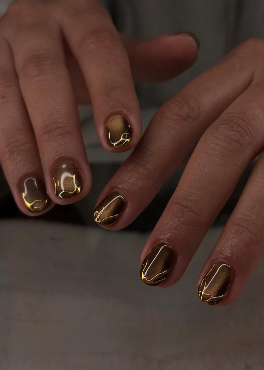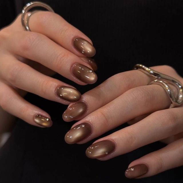 В центре внимания оказались интенсивные, приглушенные палитры. На пике популярности - глубокий коричневый, шоколадный, угольно-черный, золотистый и теплый янтарный. Благодаря технике наслаивания геля и использованию магнитов создается уникальный двух- или трехцветный градиент. Дизайн напоминает бархатистое полотно, где один оттенок плавно перетекает в другой, создавая иллюзию драгоценного свечения.