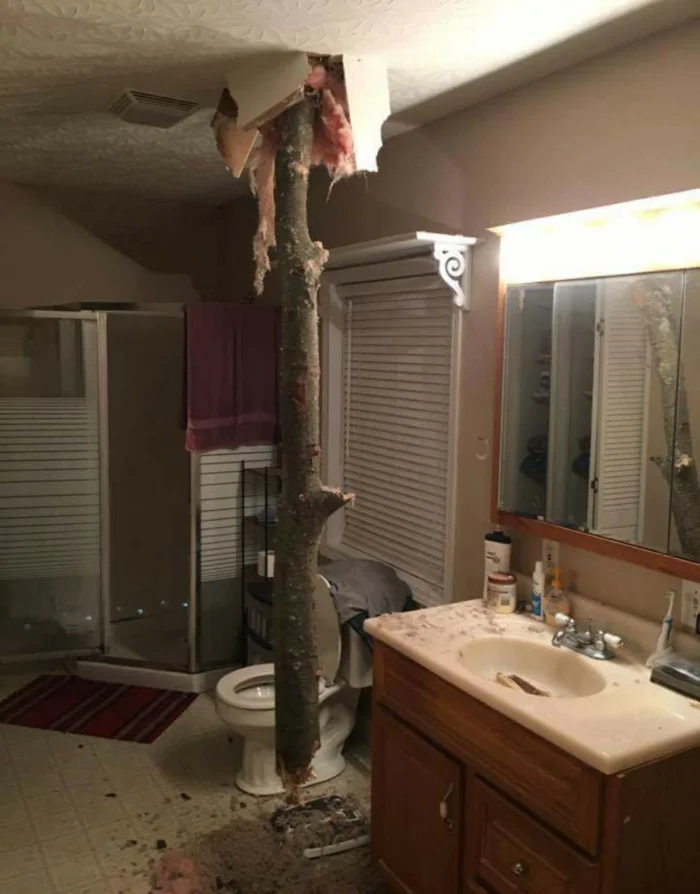 - Утренний шок: дерево, упавшее прямо в ванную.