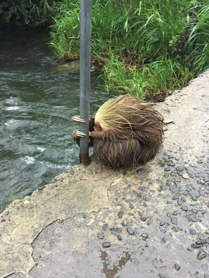 - Ленивец в Коста-Рике, цепляющийся за столб после урагана Отто.