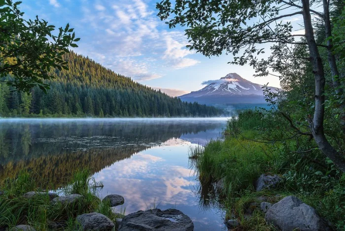 15. Озеро Триллиум в северном Орегоне, США, – водная гладь, окружённая горами и лесами.