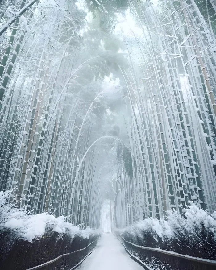 5. Заснеженный бамбуковый лес Арасияма в Киото, Япония, – зимняя симфония тишины и грации.