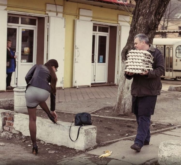 Парень смотрит на красотку и не видит подвоха. Руки заняты - сумку не поймать. Классика мультфильмов вживую. Главное, чтобы рояль не упал 🍌